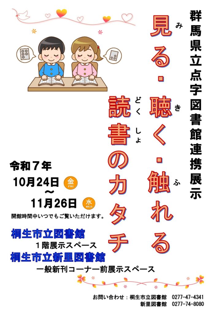 桐生市立図書館と桐生市立新里図書館で群馬県立点字図書館連携展示として「見る・聴く・触れる 読書のカタチ」を行います。