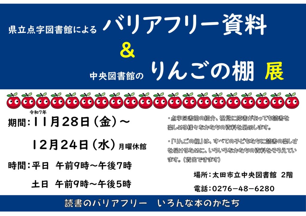 太田市立中央図書館で群馬県立点字図書館連携展示として「県立点字図書館によるバリアフリー資料&中央図書館のりんごの棚展」を行います。